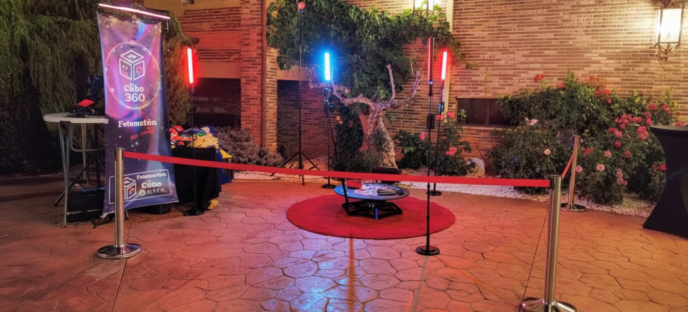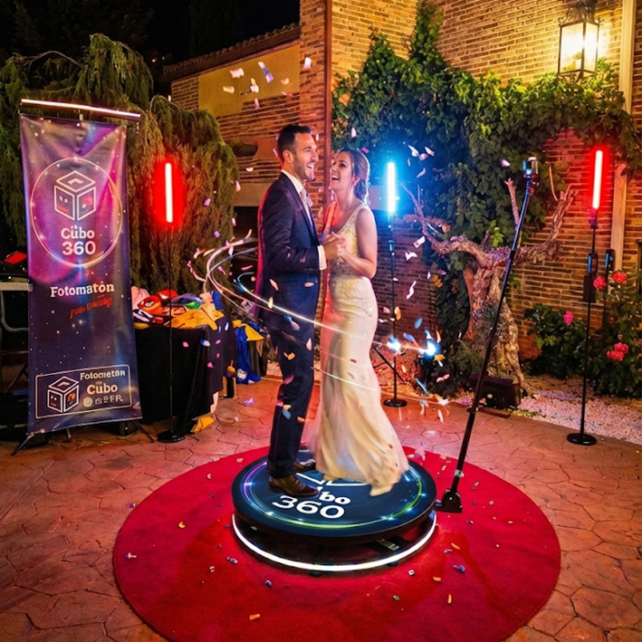 Plataforma 360º: Captura la fiesta desde todos los ángulos La tendencia número uno en eventos ya está aquí. Nuestra plataforma crea vídeos dinámicos y divertidísimos que giran a tu alrededor.